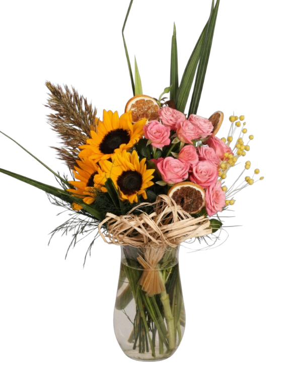 Vazoda Pembe Güller Ve Günebakan Çiçekleri