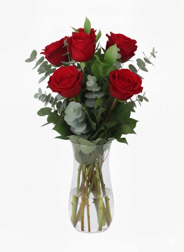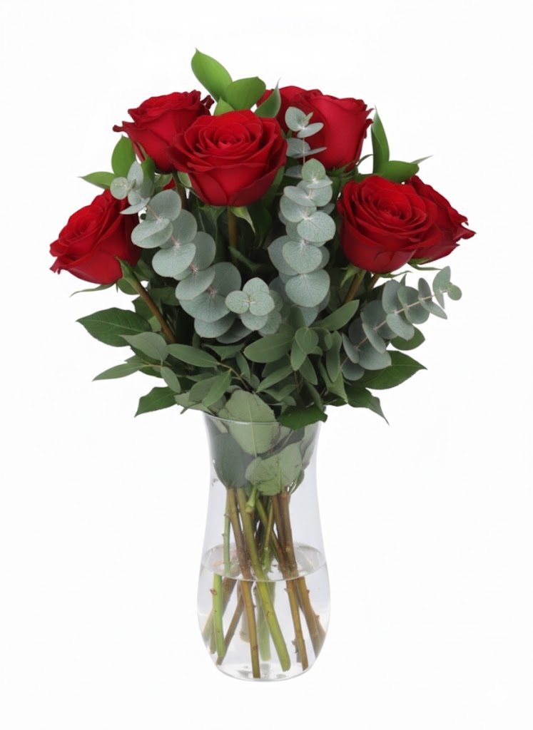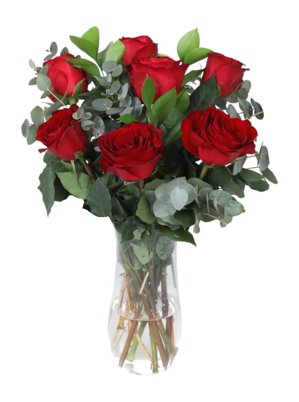 Aşkın en saf ve en tutkulu hali olan kırmızı güller, modern bir dokunuşla bir araya geliyor. Özenle seçilmiş 7 adet birinci sınıf kırmızı gül, okaliptüs dallarının ferahlatıcı yeşilliği ile harmanlanarak şeffaf cam vazoda beğeninize sunuluyor.