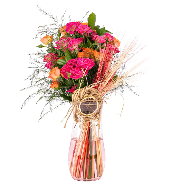 Cam Vazoda Turuncu Pembe Çardak Güller