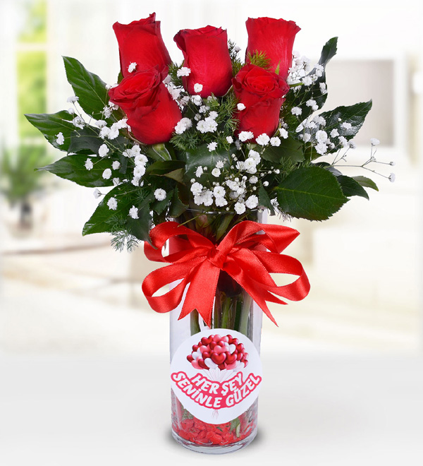 Flüt Vazoda 5 Kırmızı Gül