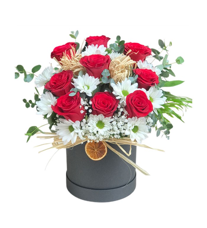 Zarafetin ve masumiyetin mükemmel uyumunu sunan bu özel tasarım, siyahın asaletini kırmızı güllerin tutkusu ve beyaz papatyaların içtenliğiyle birleştiriyor. Sevdiklerinize hem modern hem de klasik bir çiçek deneyimi yaşatmak için özenle hazırlandı.