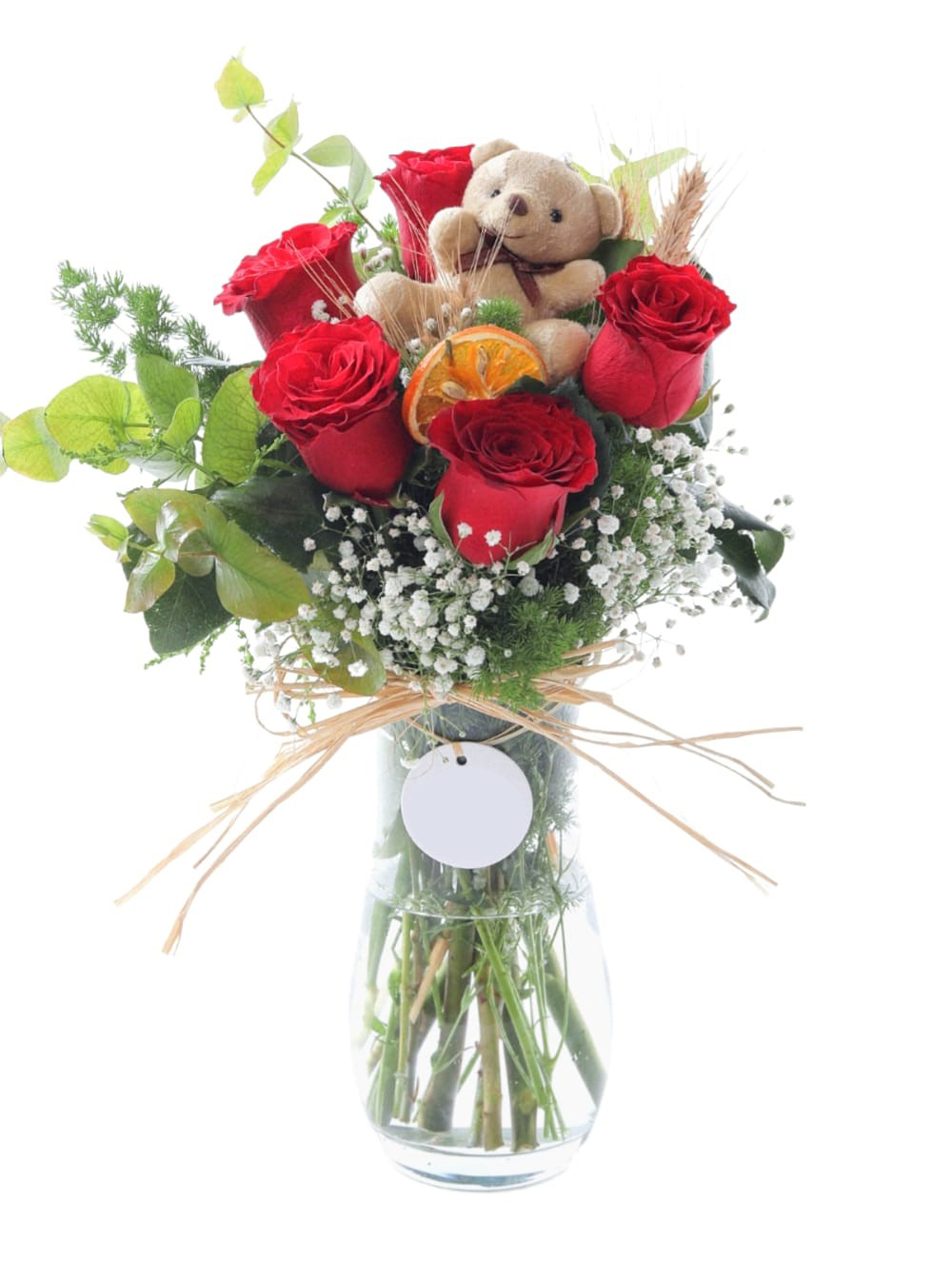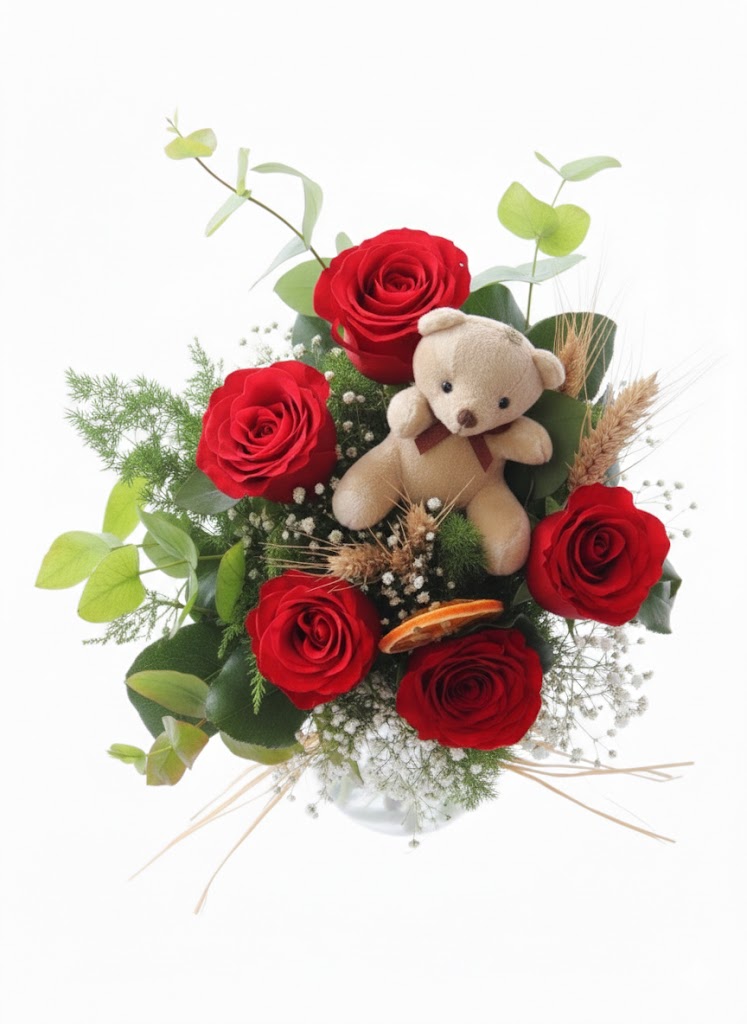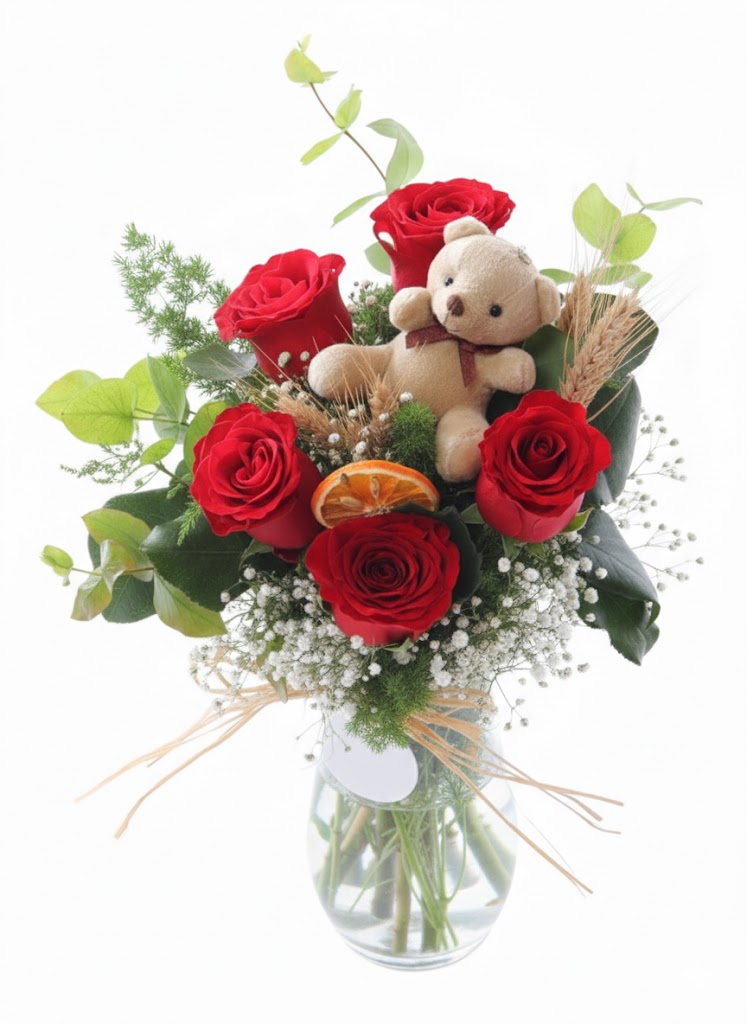 Klasik zarafeti sevimli bir dokunuşla birleştiren bu aranjman, duygularınızı en sıcak şekilde ifade etmek için tasarlandı. Canlı kırmızı güllerin tutkusu, kuru portakal dilimlerinin doğal kokusu ve yumuşacık bir peluş ayıcığın sempatisiyle sevdiklerinizin yüzünde unutulmaz bir gülümseme yaratın.
