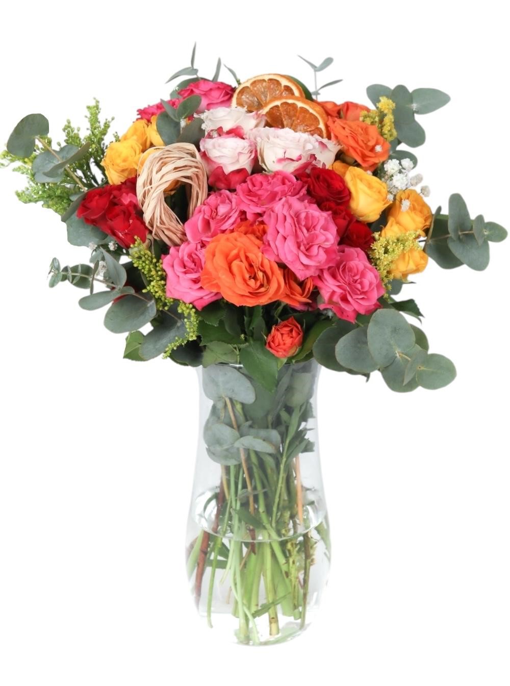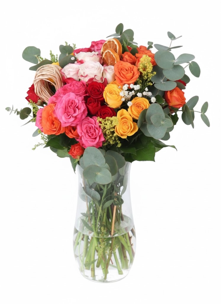 Doğanın en canlı renklerini bir araya getiren bu özel aranjman, farklı tonlardaki güllerin enerjisini okaliptüsün sakinliğiyle harmanlıyor. Şeffaf cam vazo içerisinde sunulan bu tasarım, hem modern hem de rustik detaylarla zenginleştirilmiştir.